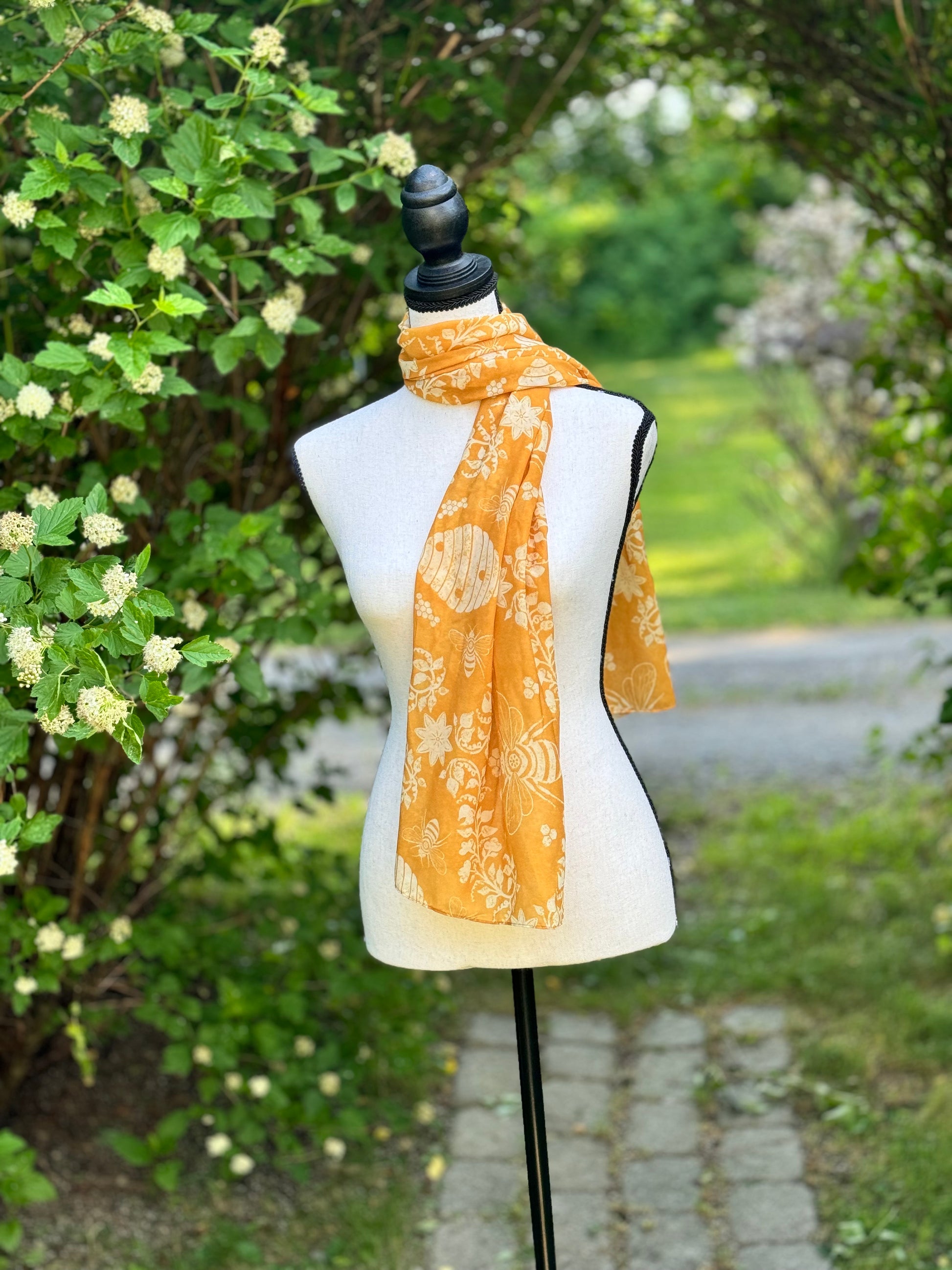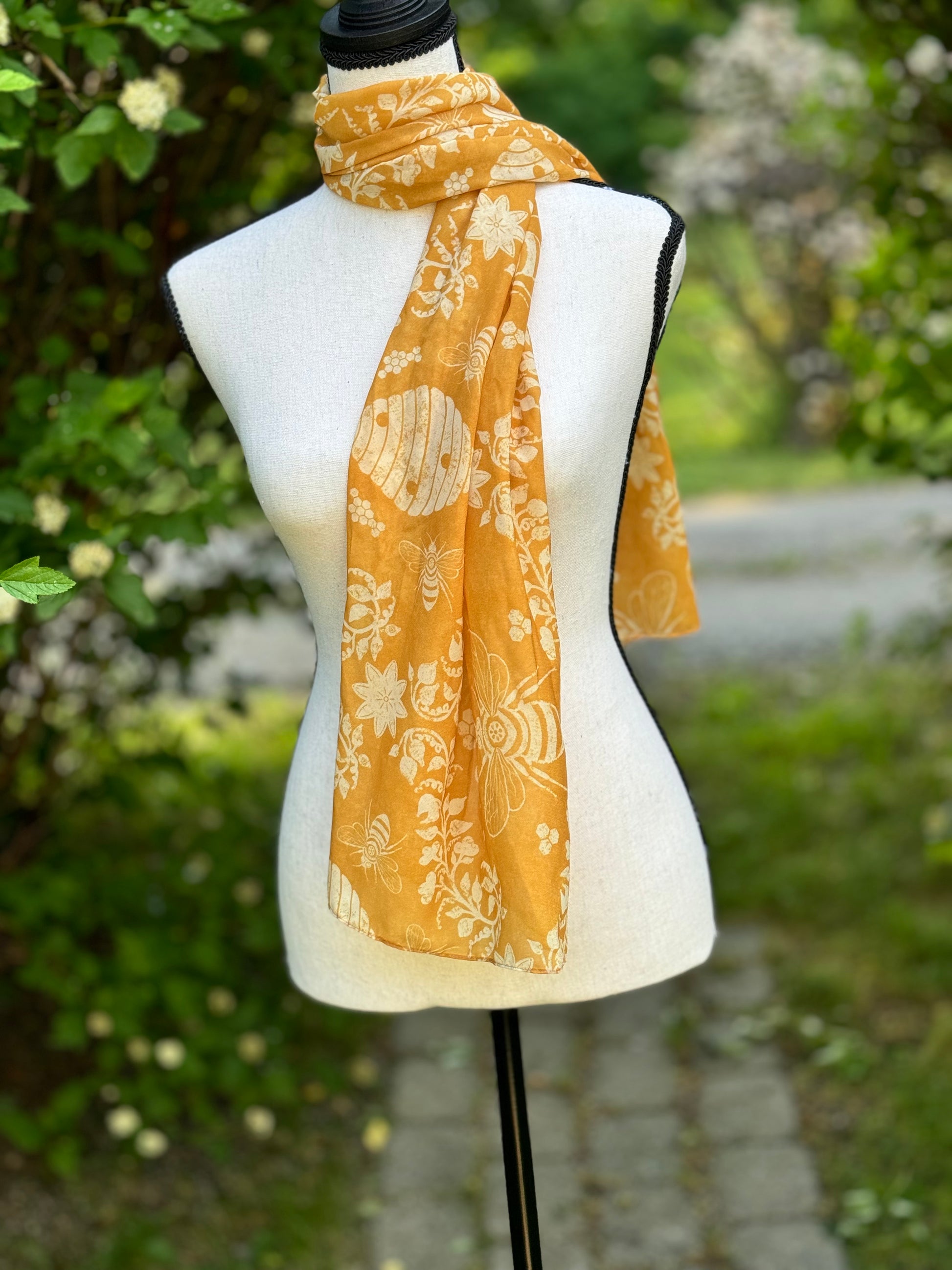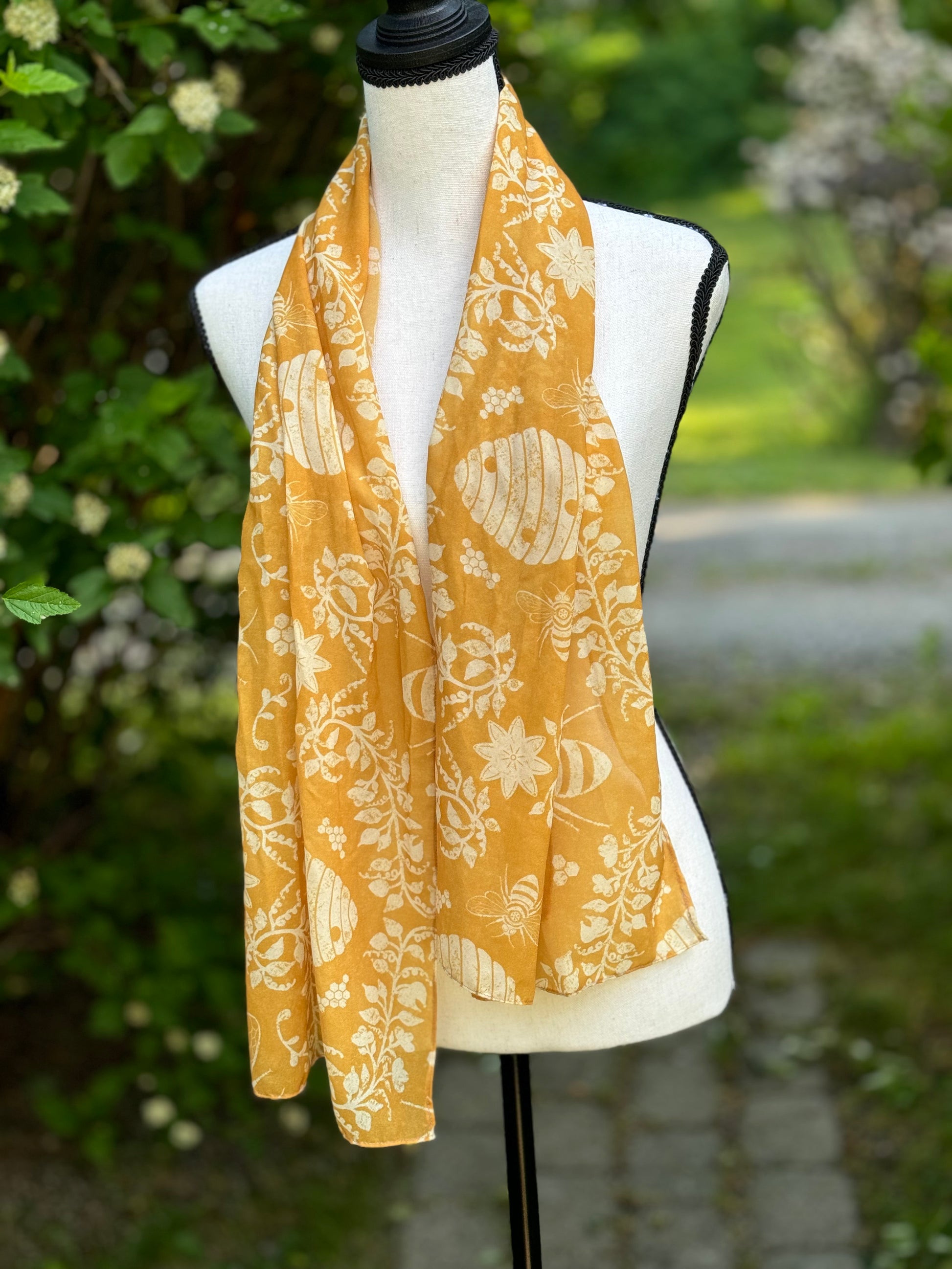 This elegant chiffon scarf features a beautiful golden hue with delicate hives and bees, adding a charming touch to any summer outfit. Made from soft fabric, it gently floats in the breeze, providing a luxurious and comfortable accessory. Elevate your summer wardrobe with this stylish and versatile scarf.