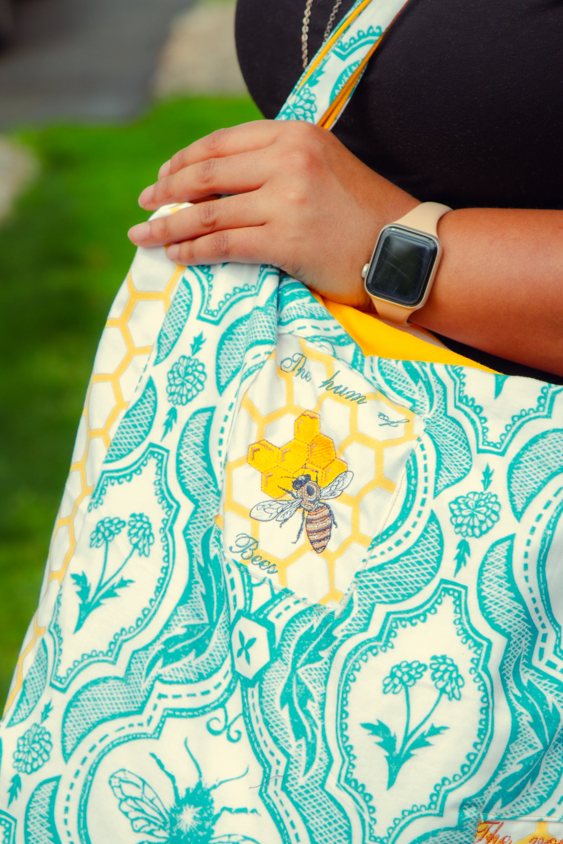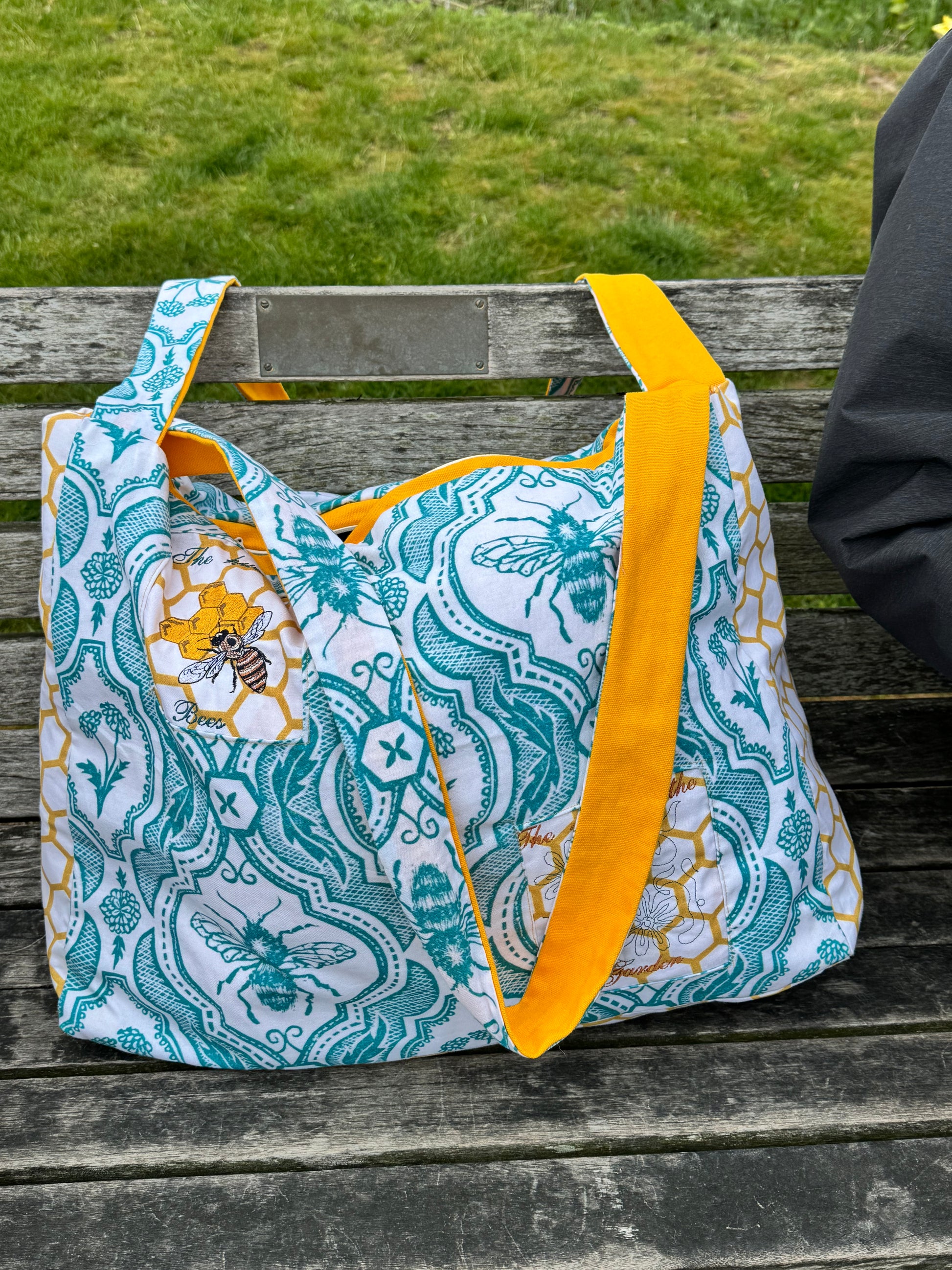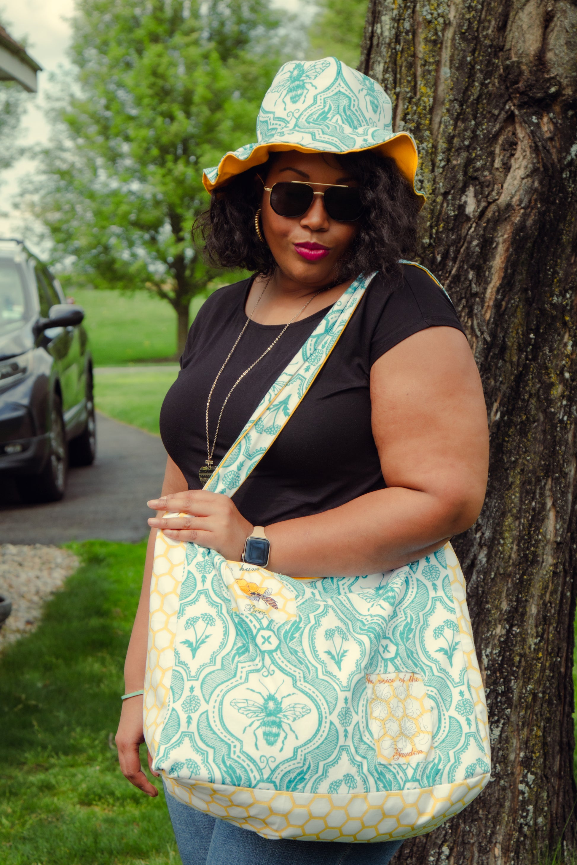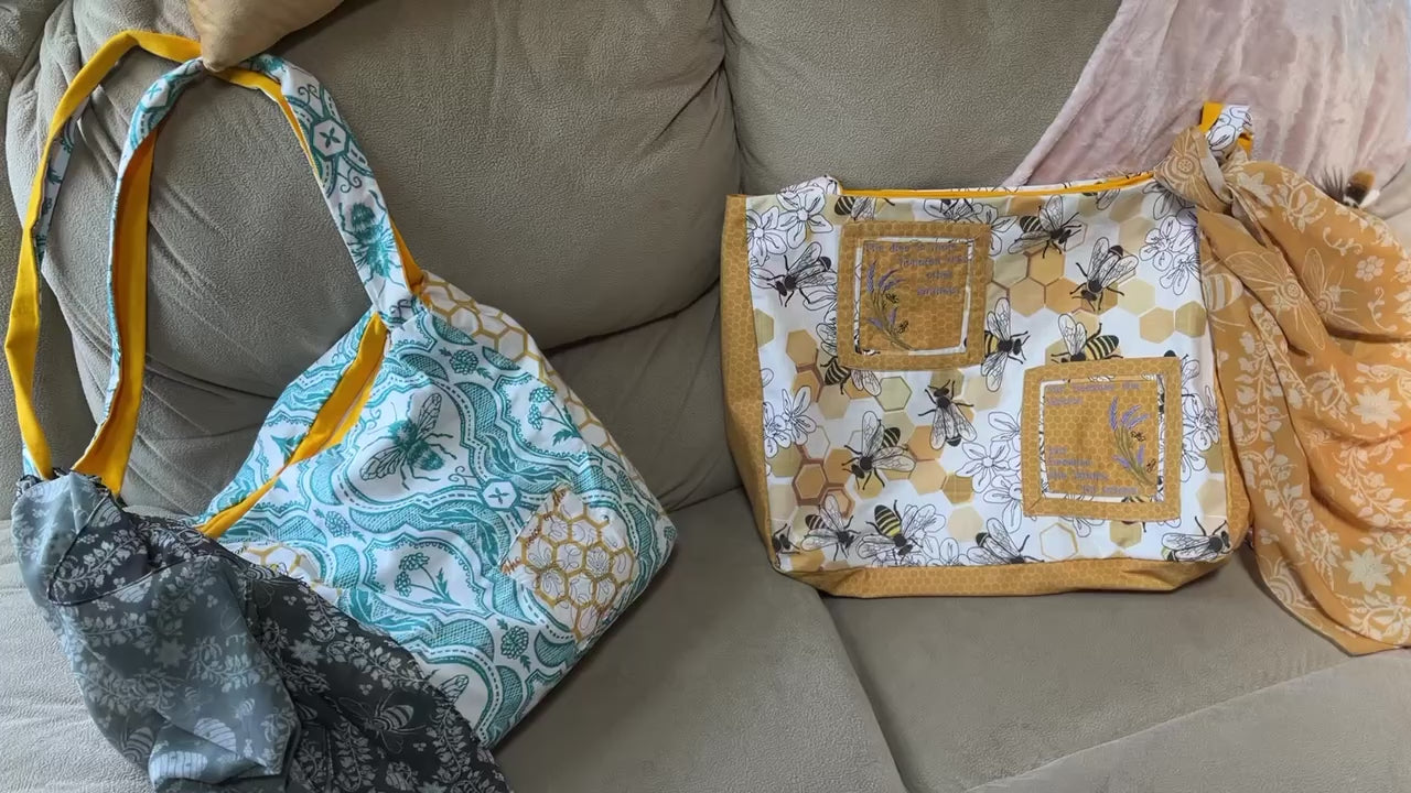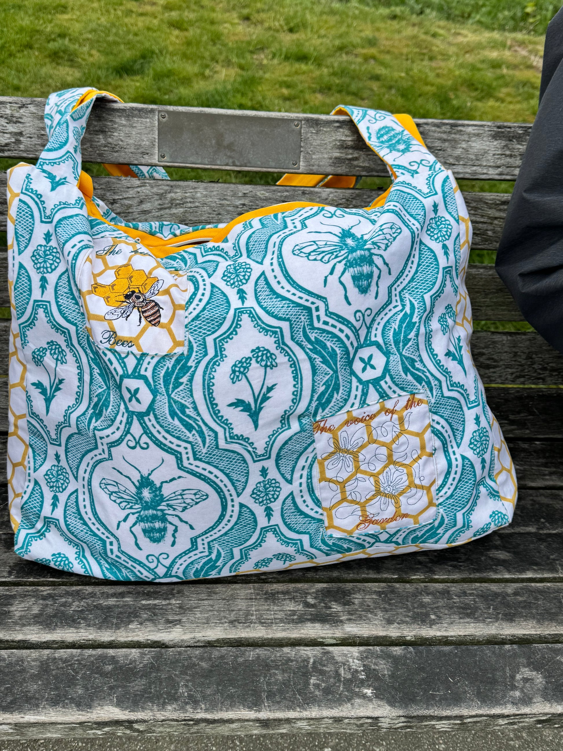 Introducing the hum of Bees Farmer's Market Tote, a large eco-friendly cotton tote perfect for any errand. Lined with sturdy canvas and featuring a vibrant bee-themed design, this versatile tote is titled "The Hum of Bees is the Voice of the Garden." Use it for overnight trips, farmers market visits, or as a chic day bag with its zippered closure. And the best part? It's durable and machine washable.