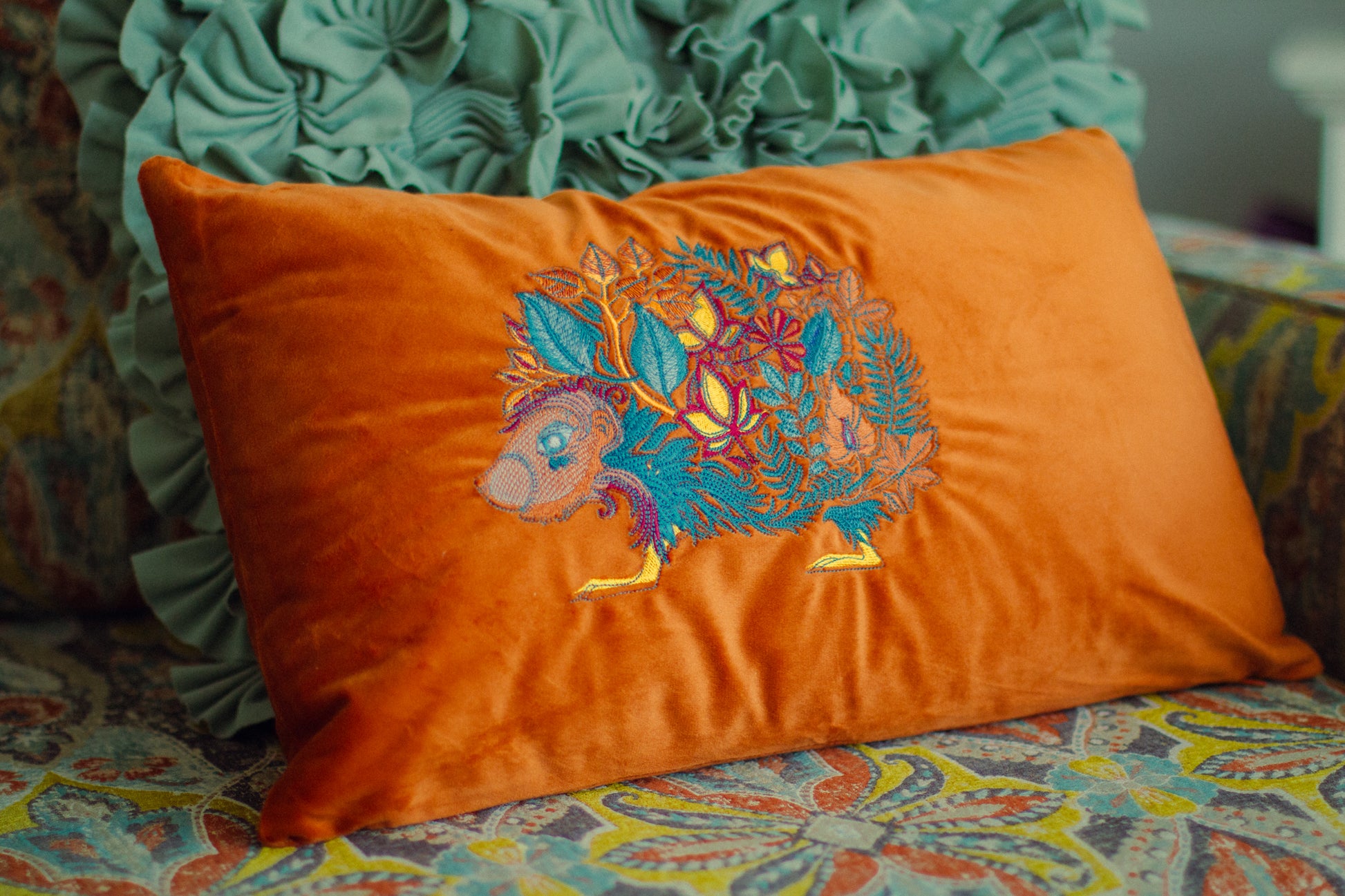 This velvet throw pillow features a custom embroidered colorful hedgehog design, adding a playful touch to any room. Made with washable velvet, it is both stylish and practical. Elevate your home decor with this unique and charming addition.